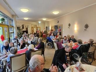Anschließend trugen die Kinder noch Gedichte vor und sangen gemeinsam mit den Senioren bekannte Weihnachtslieder. Im Nu war es auch schon Mittag, welches zum ersten Mal vom DRK-Ernährungszentrum geliefert wurde, denn in der Regel wird immer mit den Tagesgästen zusammen in der Einrichtung frisch gekocht. Es waren aber alle begeistert von den leckeren Entenkeulen mit Rotkohl und Klößen und auch der Zeit, die die Mitarbeiter dadurch mehr ihren Gästen widmen konnten. Nach einer kurzen Mittagsruhe, kamen alle wieder am gemütlichen Kaffeetisch zusammen und genossen die verschiedenen Torten bei einer Tasse Kaffee. Doch plötzlich klopfte es an der Tür und der Weihnachtsmann betrat die Stube.