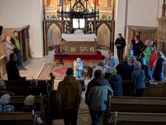 Das Programm startete mit einem Vortrag von Thomas Kuzio über die Fenster der Groß Markower Kirche, die er vor fast genau 30 Jahren restaurierte. Im Anschluss sorgte Gernot Fischer mit einem Konzert auf der Nyckelharpa für einen musikalischen Genuss. Danach führten Dorotea Laab und Andreas Vorpahl, zwei in Groß Markow ansässige Restauratoren, die Gäste durch sowie um die Kirche und gaben wertvolle historische Einblicke.