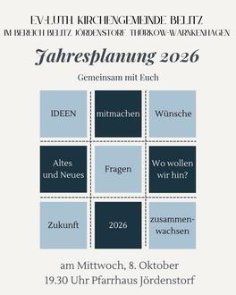 Das wollen wir gemeinsam mit Ihnen und Euch herausfinden. Deshalb laden wir am Mittwoch, 8. Oktober um 19.30 Uhr ins Jördenstorfer Pfarrhaus zu einem gemeinsamen Abend ein. Und dann kommen Fragen „auf den Tisch“ wie: Was wollten Sie/ wolltet Ihr schon immer mal gerne mit anderen machen? – Welche Ideen gibt es für unser Miteinander in der Kirchengemeinde? - Was braucht es zum weiteren Zusammenwachsen unserer Kirchengemeinde? – Wie würden Sie sich/ würdet Ihr Euch gerne einbringen? Was sollten wir als Kirchengemeinde im ländlichen Raum mal machen? Ihre und Eure Ideen für unsere Arbeit.