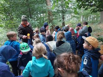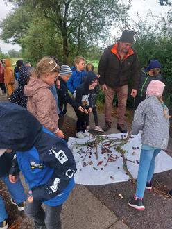 An einem Tag erhielten wir Besuch von Herrn Thormann und seiner Jagdhündin. Zunächst erzählte er viel Wissenswertes über Pflanzen und Tiere. Auf der anschließenden Wanderung in den Tellower Wald konnten die Kinder das Gelernte praktisch anwenden. So gestalteten sie mit Hilfe von Naturmaterialien den Aufbau eines Baumes nach. An einem anderen Tag war großes Herbstbasteln angesagt. Viel Spaß hatten alle Kinder beim Schneiden von Früchten und Blättern, beim Basteln eines Laubigels oder eines Fliegenpilzes.