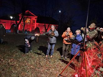 Schön bunt gestaltet lockte die doppeldeutige Einladung zur Glühwei(h)n-Nacht unzählige Besucher Ende November (nicht etwa erst zu Weihnachten!!) nach Bristow bzw. Bülow zum Glühweintrinken. Glühwein war natürlich nicht alles, was ihnen an diesem späten Nachmittag kulinarisch, optisch und akustisch geboten wurde. Weithin hörbar riefen die Weihnachtslieder der Bülower Bläsergruppe ankommende Gäste zum Festplatz. Lichterketten erhellten das gesamte Areal, auch das Festzelt und kletterten bis in die Spitzen der Weihnachtsbäume. Am beeindruckendsten aber waren das in ein leuchtend rotes Lichtmeer getauchte Bülower Schloß und das Bristower Taubenhaus. Hie und da flammten wärmende Feuer in großen Schalen auf: Knüppelkuchen gabs hier draußen, Pommes und Bratwurst.