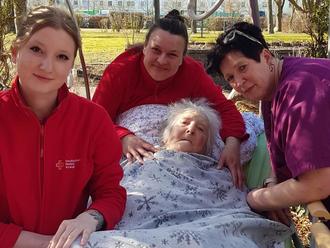 gemacht. Mit vereinten Kräften wurde ihr Pflegebett vorsichtig durch die Gänge, in den Fahrstuhl und schließlich durch die großen Glastüren hinaus in die Parkanlage der DRK-Einrichtung geschoben. Gemeinsam mit den DRK-Mitarbeitenden und sogar ihrer Tochter Kerstin Pieschkalski, konnte Wilma Eggert noch einmal einen der ersten warmen Tage des Jahres an der frischen Luft erleben. „In der Palliativversorgung zählen nicht die großen medizinischen Apparate, sondern die Erfüllung der kleinsten, tiefsten Wünsche", berichtet Daniela Blaubach, die diesen Ausflug ins Grüne gemeinsam mit vielen anderen Mitarbeitenden möglich machte und ergänzt: „Dort, inmitten der blühenden Frühlingsrabatten, fand Frau Eggert ihren Platz in der Sonne."