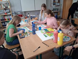 Nach dem Film gingen die Kinder an verschiedene Orte, um sich die Arbeitsblätter zum Leben Friedensreich Hundertwassers (ein selbst erfundener Name aus Friedrich Stowasser) in Einzel-, Partner- oder Gruppenarbeit zu Gemüte zu führen. Hierbei erfuhren sie nicht nur etwas mehr zum Leben des Künstlers, sondern durften auch schon selbst kreativ werden. Sie konnten sich einen eigenen Namen und die passende Unterschrift ausdenken (so wie er selbst es getan hatte - weil „sto“ auf Russisch 100 heißt, wurde aus „Stowasser“ eben Hundertwasser) oder ihm verschieden farbige Socken malen, die er immer trug. Auch sein Segelschiff „Regentag“ lernten sie kennen, mit dem er viele Reisen unternahm. Und so nähern sie sich Schritt für Schritt dem Künstler und tauchen ein in seine Denkweise. Auch dass er sagte: „Langsam malen!“ hilft, sich in die Formen seines Schaffens hineinzuversetzen.