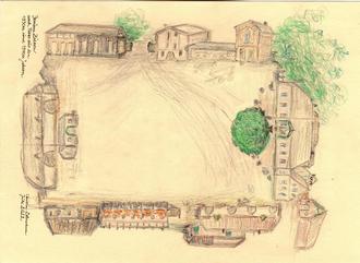 oben: Wohnhaus mit Wirtschaftshaus; dahinter befanden sich Hühnerstall und Ferkelstall; rechts oben Schweinestall; links vom Wohnhaus der Park und Gutsgarten (dieser wurde anlässlich des 750. Jubiläums 1980 zum Sportplatz umgestaltet)