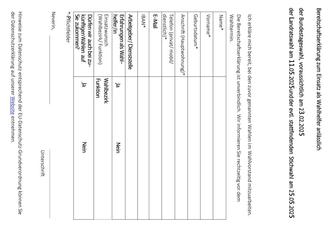 Für Ihre Bereitschaftserklärung können Sie das folgende nachfolgende Formular nutzen und es ausgefüllt per E-Mail an n.alexander@amtneverin.de bzw. postalisch an die Gemeindewahlbehörde übersenden.