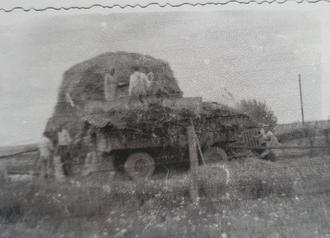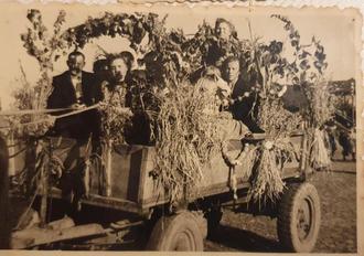 Beim Dreschen festlich geschmückter Erntewagen