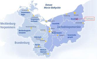 Förderregion Kooperationsprogramm Interreg VI A (Quelle: https://www.interreg6a.net/programmgebiet/, Lage Tychowo nicht maßstabsgetreu)