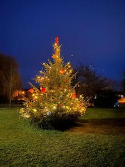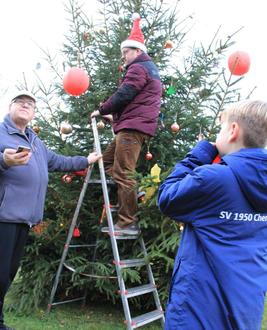 Pünktlich zum 1. Advent stand die „Tanne“, die Hartmut Kühl gespendet hatte bereit, um ab 15 Uhr geschmückt zu werden. Das Aufstellen am Donnerstag vor dem 1. Advent erledigten Hartmut Kühl, Roland Kositzki, Joachim und Max Ader. Max Ader war es auch, der die Lichterkette anbrachte, so dass dem Baumschmücken nichts mehr im Wege stand.