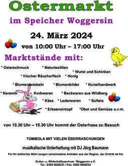 Am Sonntag den 24. März 2024 öffnet der Speicher Woggersin seine Tore für den beliebten Ostermarkt. Von 10.00 bis 17.00 Uhr stehen Erdgeschoss, Obergeschoss und Hof des Speichers wieder offen für die Besucher und laden zum Verweilen ein. Händler aus der Region bieten die verschiedensten Produkte an, z.B. Osterschmuck, Naturtextilien, Keramik- und Korbwaren, Pflanzen, Wurst, Schinken, Räucherfisch, Käsespezialitäten, Obst, Gemüse, Honig, Backwaren und vieles mehr.