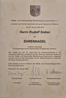 Rudolf Sieber aus Neuendorf war 26 Jahre lang und ohne Unterbrechung Gemeindevertreter in unserer Gemeinde. Er hat sich in dieser Funktion stets erfolgreich für das Wohl unserer Gemeinde eingesetzt und dadurch auf besondere Weise verdient gemacht. Dafür ist er jetzt auf unserer letzten Gemeindevertretersitzung am 28.Januar vom Städte- und Gemeindetag Mecklenburg-Vorpommern e.V. mit der Ehrennadel des Verbandes ausgezeichnet worden. Die Ehrung wurde in seinem Auftrag vorgenommen von unserem Bürgermeister Marcel Thiele und seinem 1. Stellvertreter Matthias Hagenow (s. Bild).