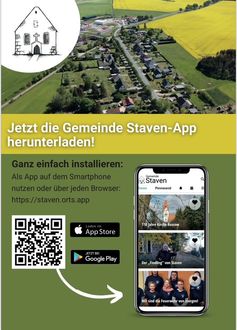 Anfang Juni 2024 ging die Gemeinde Staven-App online. Mittlerweile hat sie eine beachtliche Reichweite. Mit der eigenen Orts-App hat die Gemeinde eine digitale Lösung zur Hand, um die Kommunikation in Staven und Rossow effizienter, ansprechender und übersichtlicher zu gestalten. Die User bleiben u. a. über den Kalender zu Veranstaltungen informiert und werden über Neuigkeiten auf dem Laufenden gehalten. Wer die Gemeinde Staven-App noch nicht nutzt, ist herzlich eingeladen, sie sich über untenstehenden QR-Code herunterzuladen.