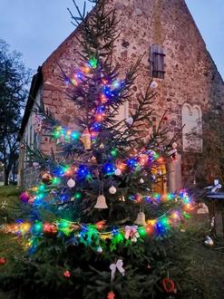 Der gemeinsam geschmückte Gemeinde-Tannenbaum vor der Dorfkirche Staven