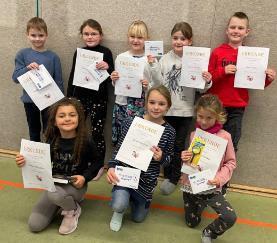 Ein weiterer Höhepunkt an diesem Tag war die Auszeichnung der Rechtschreibprofis in der Turnhalle. Mit großem Applaus erhielt aus jeder Klasse das Kind mit den sichersten Rechtschreibleistungen eine Urkunde, einen Gutschein und eine kleine Überraschung.