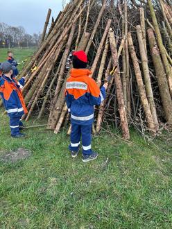 Das Osterfeuer wurde von der Feuerwehrjugend entzündet. Mit Fackeln in der Hand zogen sie im festlichen Ummarsch zum bereitstehenden Holzstapel. Unter dem Nachthimmel flackerte das Feuer auf und verbreitete eine warme Atmosphäre. Die Funken stiegen hoch, während die Menschen sich um das Feuer versammelten und Geschichten austauschten.