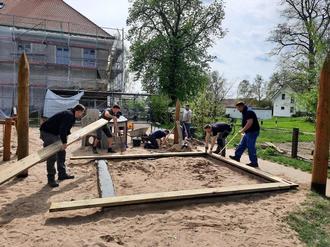 Am 13.04.2024 um 9 Uhr trafen sich die Eltern bei bestem Wetter mit Schubkarren, Schippen, Pinsel, Harken, Akkuschrauber und noch vielem mehr an der Kita in Brunn. Es wurden Zäune und ein kleines Spielhaus angestrichen, der „Rutschberg“ bekam neue Reifen. Diese mussten auch mit Erde gefüllt werden, damit alles festen Halt hat.