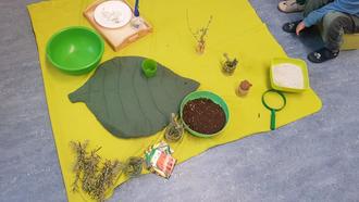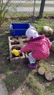 Man sieht drinnen und draußen Kinder mit Lupen auf Teile von Pflanzen und andere Schönheiten der Natur erblicken. Unsere Gallerie bietet häufig wechselnde Austellungen der Kinderkunstwerke. Auch auf dem Hof wird es bunt. Essbare Wildkräuter, typische Beetpflanzen und Früchte bearbeiten wir regelmäßig zusammen.