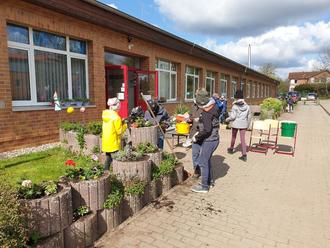 Am 27. April fiel an unserer Schule der Startschuss ins Frühjahr. Alle Kinder sowie über ein Dutzend Eltern sowie Omas und Opas kamen zum Arbeitseinsatz auf das Schulgrundstück. Mit Spaten, Schüppen, Besen und Gießkannen bewaffnet, schritten alle voller Elan zur Tat. Unsere Kleinen rollten Saatbomben, säten Kapuzinerkresse und verwandelten einen ausrangierten Feinstrumpf in einen lustigen Kresseigel. Die Großen aus den 4. Klassen bereiteten den Schulgarten und den Sportplatz für die Saison vor. Im Garten entstand mit großer Manpower ein vorzeigbarer Weg, der mit Rindenmulch aufgefüllt werden konnte. Die Kinder der 3. Klassen kümmerten sich um die Pflanzkübel auf dem Schulhof. Es wurden Petunien, Geranien und andere Sommerblüher liebevoll arrangiert. Kinder aus der 3b hatten folgende Meinungen zu diesem Vormittag: