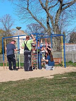 Zur Kräftigung gab es zum Mittag eine leckere Gulaschsuppe die gemeinsam auf der Wiese eingenommen wurde. Nach der Mittagspause ging es weiter Hand in Hand. Bis um 18 Uhr der letzte Pinselstrich am geschliffenen Metallklettergerüst vollendet wurde.