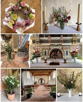 Liebevoll arrangierter Blumenschmuck zur Andacht in der Kirche Roga