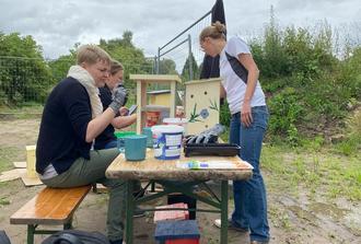 Kathleen Münchow, Martina Gierth und Yvonne Russow von der E.DIS gestalteten Nistkästen für die Kita „Kinnerstuw“.