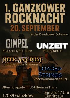 Am 20.09.2025 lädt der Heimatverein Ganzkow e.V. zur ersten Ganzkower Rocknacht ein. Kommt vorbei und genießt gleich 4 Live Bands an einem Abend. Rockt mit uns die Scheune und tut ganz nebenbei etwas Gutes, denn die Einnahmen fließen in unseren gemeinnützigen Verein.