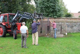 Bei Transport und Montage der fertigen Platte mussten Max Ader im Traktor sowie (v.l.n.r.) Manfred Rothschuh, Hartmut Kühl und Joachim Ader Vorsicht walten lassen.