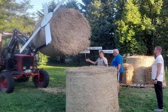 Wie immer ist nicht nur Stroh vonnöten, sondern auch schwere Technik, um alles an den richtigen Platz zu bringen. V.l.n.r. Joachim, Roland und Steve warten, dass Max die Rolle so platziert, damit diese dann mit Schwung per Hand auf die untere Strohrolle gekippt werden kann.