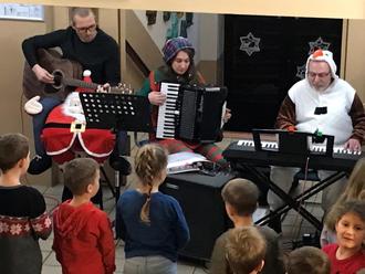 Adventssingen in der Grundschule! Mit einem kleinen Weihnachtskonzert begann wieder der letzte Schultag vor den Weihnachtsferien. Es ist an unserer Schule zu einer vorweihnachtlichen Tradition geworden den Projekttag „Weihnachten“ mit einem gemeinsamen Schulweihnachtssingen einzuläuten. Musikalisch begleitet wurde unser „Weihnachts- Chor“ von einer weihnachtlichen „Lehrerband“. Frau Sofia Binney am Akkordeon, Herr Marten Banczyk mit der Gitarre und Herrn Olaf Schulz, am Key- Board. Die stilvoll, passend zum Anlass weihnachtlich gekleideten Musiker begeisterten alle Schüler, Gäste und Kollegen der Grundschule. Zu handgemachter Livemusik sangen alle den letzten Schultag vor den Weihnachtsferien ein. Da kam so richtig Weihnachtsstimmung auf bevor sich dann alle in ihre Weihnachtsprojekte stützten um diesen besonderen Schultag so richtig weihnachtlich zu verbringen. Eltern und andere morgendliche Besucher wurden von den schönen Weihnachtsliedern in Adventsstimmung versetzt und verließen lächelnd unsere Schule. Vielleicht weckte das kleine „Konzert“ auch bei ihnen die Lust, es selbst wieder einmal mit dem Singen von Weihnachtsliedern zu versuchen? In unseren Klassen ist es jedenfalls in den Tagen vor Weihnachten Brauch, den Schultag mit dem Singen von Weihnachtsliedern und manchmal auch dem Vorlesen kleiner Weihnachtsgeschichten zu beginnen. Jeden Tag öffnet danach ein anderes Kind ein Kalendertürchen und so, auf Weihnachten eingestimmt fällt es nicht mehr schwer, die Zeit bis zu den Weihnachtsferien mit fleißigem Lernen zu verbringen. Natürlich ist auch an unserer Schule die Vorweihnachtszeit mit vielen Überraschungen und Projekten der Klassen ausgefüllt, doch dieses Adventssingen war ein ganz besonderer Höhepunkt. Im Musikunterricht haben die Klassen fleißig Weihnachtslieder geübt und sich so auf dieses Adventssingen optimal vorzubereiten.