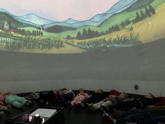 Jede Klasse erlebte fast eine Stunde eine Reise durch unser Sonnensystem, eine Sonne-Mond und Sterne/ Astronomieperformance im mobilen Planetarium.