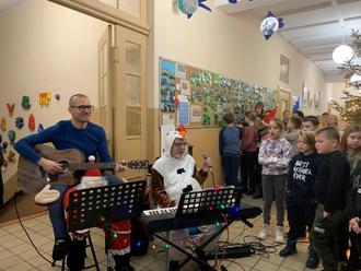 Adventssingen in der Grundschule! Mit einem kleinen Weihnachtskonzert begann wieder der letzte Schultag vor den Weihnachtsferien. Es ist an unserer Schule zu einer vorweihnachtlichen Tradition geworden den Projekttag „Weihnachten“ mit einem gemeinsamen Schulweihnachtssingen einzuläuten. Musikalisch begleitet wurde unser „Weihnachts- Chor“ von einem weihnachtlichen „Lehrerduo“. Herr Marten Banczyk mit der Gitarre und Herrn Olaf Schulz, am Key- Board. Die stilvoll und passend zum Anlass weihnachtlich gekleideten Musiker begeisterten alle Schüler, Gäste und Kollegen der Grundschule.