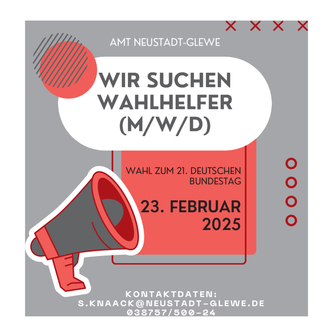 Zu der anstehenden Wahl zum 21. Deutschen Bundestag am 23.02.2025 sucht das Amt Neustadt-Glewe noch ehrenamtliche Wahlhelfer/innen zur Bildung der Wahlvorstände und Ersatzpersonen für den Wahlbereich Neustadt-Glewe, Blievenstorf und Brenz. Die Wahlvorstände und Ersatzpersonen sorgen am Wahltag dafür, dass die Wahlhandlung ordnungsgemäß durchgeführt werden kann.