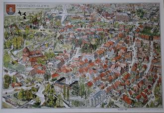 Zu den zahlreichen Bildern des Nordens, die Werner Schinko schuf, gehört auch das farbige Vogelschaubild unserer Stadt, heute in unserer Stadtinformation in den Abmaßen von ca. 0,58 x 0,83 für nur 5,75 Euro als Plakat käuflich zu erwerben.