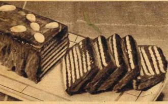 Das Kokosfett erhitzen, den gesiebten Staubzucker mit Kakao, Kaffee, Weinbrand und Eier verrühren, dabei allmählich das sich abkühlende Fett zugießen. In eine mit Butterbrotpapier ausgelegte Kastenform eine Schicht Schokoladenmasse geben, darauf eine Schicht Kekse legen, solange bis die Schokoladenmasse aufgebraucht ist. Die letzte Schicht müssen Kekse sein.