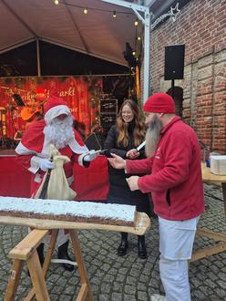 Die stellvertretende Stadtpräsidentin Karoline Herrmann verkaufte zusammen mit Bäckermeister Thomas Mahnke den Riesenstollen.