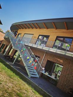 Das neue Hortgebäude wurde auf dem Grundstück der Grundschule errichtet und bietet derzeitig Platz für insgesamt 222 Kinder. Unser Hortteam hat ein kreatives und modernes Raumnutzungskonzept entwickelt, um ein breites Spektrum an Betreuungsangeboten bieten zu können. Hiernach wurden Themenräume wie ein Kreativraum, eine Werkstatt, ein Spielraum, ein Bau- und Konstruktionsraum, ein Medienraum, ein Ruheraum, ein Musik- und Theaterraum und ein Bewegungsraum geschaffen. Des Weiteren beinhaltet der Hortneubau eine großzügige Mensa, in der die Kinder mit einem leckeren und gesunden Mittagessen versorgt werden.