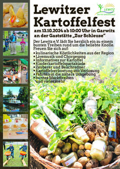 Das nun schon traditionelle Kartoffelfest des Vereins Lewitz e. V. findet am 13.10.2024 von 10.00 - 17.00 Uhr anlässlich des 30-jährigen Firmenjubiläums der Gaststätte „Zur Schleuse“ in Garwitz an der Gaststätte statt. Neben dem Tüffeltest (aus 4 Sorten die geschmacklich Beste wählen) gibt es natürlich nicht nur Kartoffeln und Zwiebeln, sondern auch Kartoffelpuffer, Leckeres vom Grill, Fleisch- und Wurstwaren vom Galloway Rind des Thomashofes Speuss, Räucherfisch und viele andere leckere Sachen. Ein Bauernmarkt, Hofflohmarkt, Falkner und Honig runden das Angebot ab. Natürlich ist auch an die Kleinsten gedacht. Spiele rund um die Kartoffewerden ihre Liebhaber finden, aber auch ein Zauberer und ein Bauchredner werden die Gäste amüsieren.