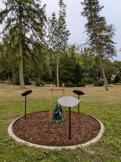 Das Grab wird mit einer Namenstafel in Nähe des Baumes gekennzeichnet.