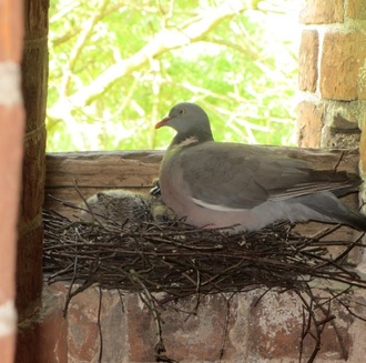 Die wachsame Taube füttert liebevoll ihre Jungen. Rechts im Bild ein junger Turmfalke. Regungslos sitzt er viele Stunden.