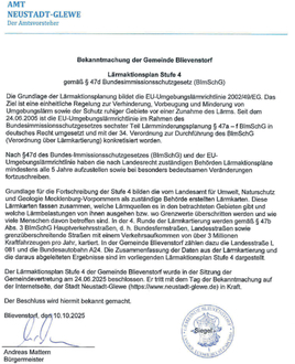 Der Lärmaktionsplan Stufe 4 der Gemeinde Blievenstorf wurde in der Sitzung der Gemeindevertretung am 24.06.2025 beschlossen. Er tritt mit dem Tag der Bekanntmachung auf der Internetseite, der Stadt Neustadt-Glewe (https://www.neustadt-glewe.de) in Kraft.