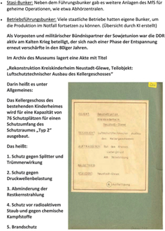 | • | Betriebsführungsbunker: Viele staatliche Betriebe hatten eigene Bunker, um die Produktion im Notfall fortsetzen zu können. (Übersicht durch KI erstellt) | |