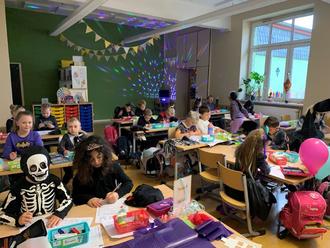 Neben Faktenwissen über Herkunft und Bedeutung dieses aus den USA stammenden Feiertages an dem wir eigentlich den Reformationstag begehen erfuhren die Kinder auch Wissenswertes über Feiertage die bei uns im November begangen werden. Natürlich waren die Kinder aufgeregt durch die Schule und die phantasievoll geschmückten Geisterklassenräume zu spuken. Kleine Schulgespenster zeigten was sie schon alles gelernt haben.