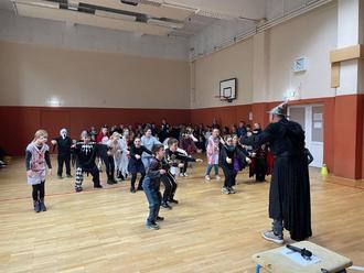 Unserer Sporthalle war von drei Zauberwesen in einen Halloween Tanzsaal verwandelt worden. Eine herrliche musikalische Tanz- und Quizstunde lang hatten die Kinder jeder Klassenstufe Zeit sich mal so richtig auszupowern.