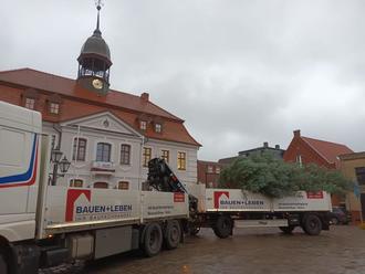 Wir danken Reik Schmerl für die Spende des diesjährigen Baumes auf dem Marktplatz und der Fima BAUEN+LEBEN Neustadt-Glewe für den Transport und die Hilfe beim Aufstellen der prächtigen Tanne am Standort vor dem Rathaus.