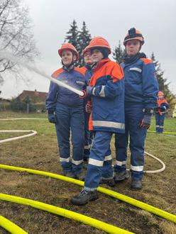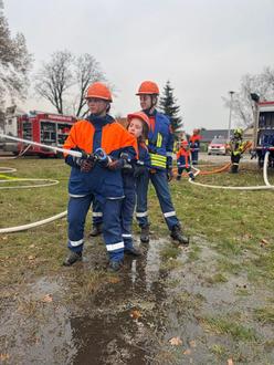 So ein Auto in stabiler Seitenlage war für die Kids schon beeindruckend. Jeder bekam seine Aufgabe und arbeitete sie ab. Fahrzeug sichern, Ölbindemittel ausbringen, Einsatzstelle absichern und Patienten versorgen. Hier sah man schnell, was wir schon alles gelernt hatten, aber auch wo es noch klemmte. Ebenso beim Einsatz beim Gestüt Lewitz. Unfallstelle sichern, Patienten betreuen, Verletzte retten, nach und nach die Aufgaben abarbeiten, mit anderen Wehren zusammenarbeiten. Spannend, lehrreich und anschaulich. Zurück im Gerätehaus gab es Mittag und den Einsatzbefehl „Aufräumen“. Kurze Zeit später dann der Einsatzbefehl Brand und lange Gesichter, da nur ein Teil der Wehr ausrückte. Schnell kehrte die Freude zurück: Erhöhung Einsatzstichwort und alles raus. Wir rückten zum Einsatzort nach Neuhof nach. Ausgerechnet hinter der Feuerwehr Neuhof war ein Container mit Holz in Brand geraten. Mit einer Vielzahl von Strahlrohren wurde der Brand von allen Seiten bekämpft. Die eine oder andere kleine Dusche inbegriffen. Da bei einem solchen Einsatz viel Wasser benötigt wird, hieß es für uns wieder Wasserversorgung aufbauen. Anschließend griffen wir auch zum Strahlrohr und halfen bei der Brandbekämpfung.