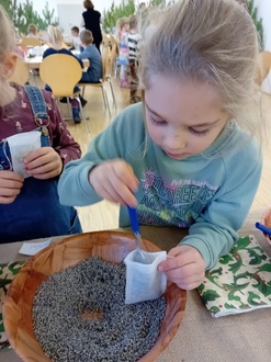 Rosmarin und Pfefferminze oder Lavendel und Kamille, ein herrlicher Duft strömte in die kleinen Kindernasen. Mit einem Löffelchen vorsichtig in ein Teebeutelchen gefüllt, einen bunten Stoff als Hülle und ein Schleifenband zum Verschließen. Schon waren sie fertig, unsere Kräutersäckchen.