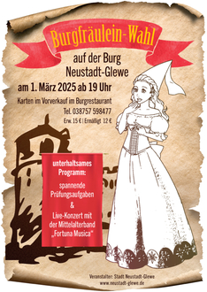 Am 1. März 2025 wird auf der Burg in Neustadt-Glewe das neue Burgfräulein gewählt. Die Wahl findet öffentlich in einem mittelalterlichen Rahmen im Burgrestaurant statt und ist jedes Mal ein kleines kulturelles Highlight auf der Burg.
