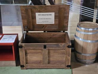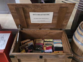 Eine gut gefüllte feine kleine Büchertruhe erwartet fortan unsere Besucher*innen und unsere Einwohner*innen!