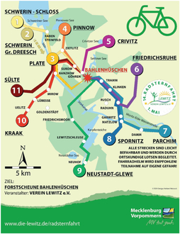 Dazu laden wir alle Radbegeisterten ein, eine entspannte und gesellige Radtour mit uns am 1. Mai in die Lewitz zu unternehmen. Ausgangspunkte und Zwischenstationen können Sie jetzt schon der beiliegenden vorläufigen Karte entnehmen. Die einzelnen Routen werden von Lotsen begleitet, so kann man unterwegs noch Wissenswertes über die Region erfahren.