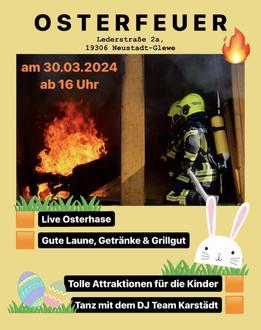Am Samstag, den 30. März ab 16 Uhr lädt die Feuerwehr Neustadt-Glewe zum Osterfest für die ganze Familie ein. Neben dem traditionellen Osterfeuer ist ein buntes Programm für Jung und Alt geplant. So können sich die kleinen Gäste auf den Besuch des Osterhasen freuen, mit dem Feuerwehrauto fahren, oder sich auf der Hüpfburg austoben. Die großen Gäste dürfen sich über einen Discoabend mit dem DJ Team Karstädt freuen. Ein weiterer Höhepunkt wird die Vorführung mit dem Brandübungsmobil sein. Für das leibliche Wohl ist gesorgt.