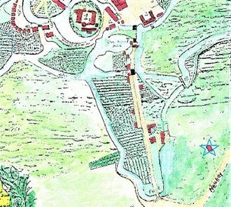 Das auf der Karte von 1711 mit einem blauen Stern gekennzeichnete Gebäude ist das Holzwärterhaus.